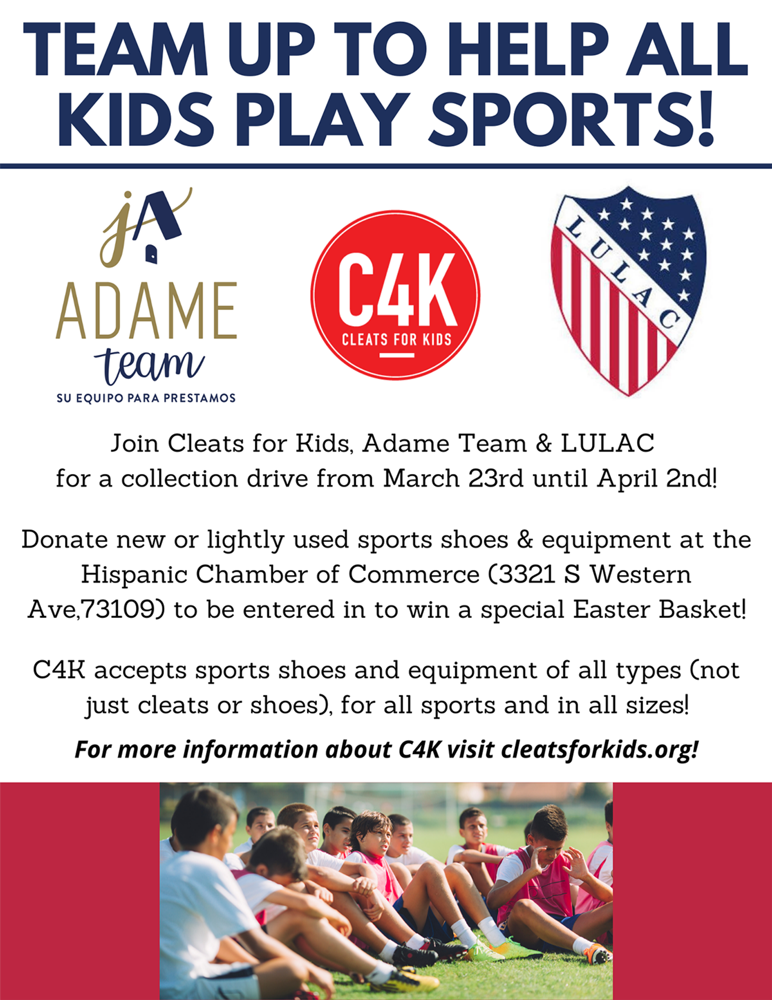 In order to keep our Locker Room stocked, C4K is honored to partner with Adame Team, LULAC Oklahoma, and the Greater Oklahoma City Hispanic Chamber of Commerce for a spring collection drive!